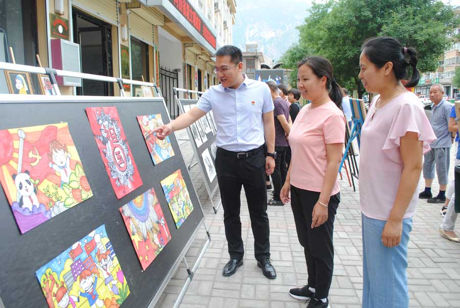6月17日,永濟(jì)市蒲園社區(qū)服務(wù)中心廣場上,“慶‘七一’、迎國慶·童心向黨”書畫展活動(dòng)吸引了市民前來觀看。