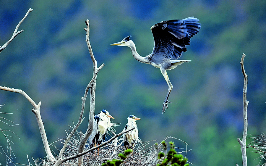 在秦嶺深處的陜西省商洛市洛南縣石坡鎮周灣村,每年春天都有近百只蒼鷺從南方遷徙而來,在山坡上3棵相擁而立的高大白皮松樹上筑巢壘窩、展翅翱翔,成為當地一處獨有的自然景觀。