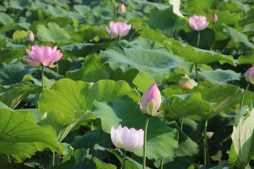 荷花屬于長日照植物,對溫度要求較高,天氣越熱,花開得越好。每年夏至前后,是一年一度賞荷的最好時機,尤以早晚時間最佳。仲夏時節,永濟市濱河公園和黃河、涑水河、伍姓湖灘涂,或自然、或人工的荷花池里,一張張荷葉重重疊疊,一朵朵荷花競相綻放,吸引著不少周邊市民、外地游客和攝影愛好者慕名而來觀光和拍照。薛啟濤 張菊紅