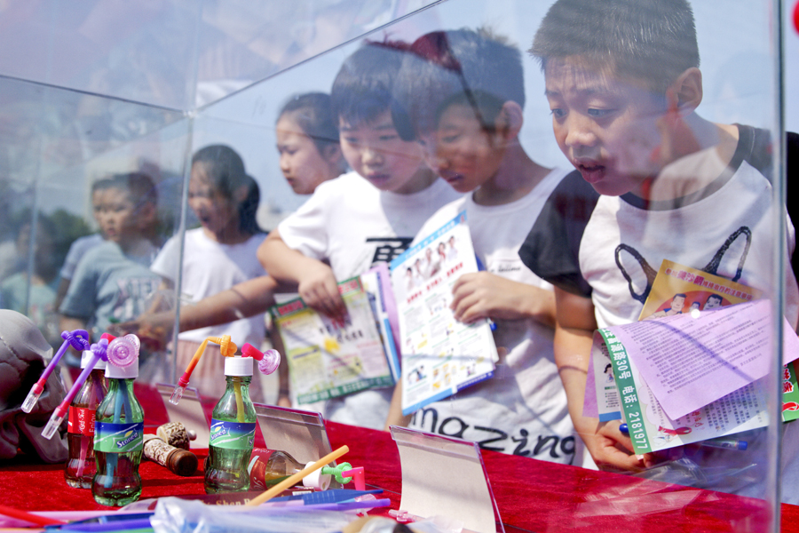 6月26日是第32個國際禁毒日。當日我市舉行禁毒宣傳活動,活動旨在讓大家通過認識毒品危害,達到遠離毒品的目的。圖為學生們在觀看吸毒工具仿真模型。 記者 樊朋展 攝