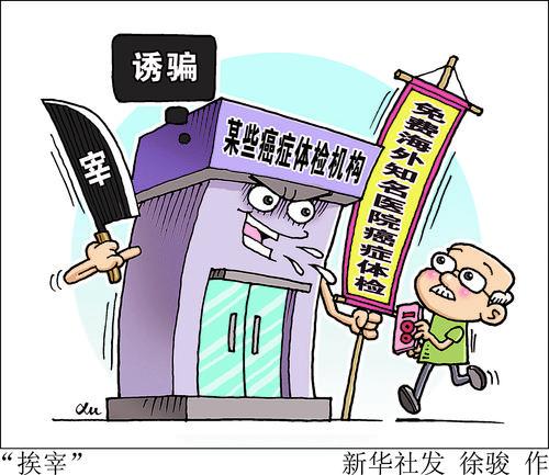 ▲明明沒有病卻被檢查出癌癥,打著“免費(fèi)海外知名醫(yī)院癌癥體檢”的幌子誘騙人上鉤,一些癌癥體檢機(jī)構(gòu)甚至雇傭無資質(zhì)人員……近年來,癌癥體檢受到不少人追捧,但記者調(diào)查發(fā)現(xiàn),這些看起來“高大上”的癌癥體檢機(jī)構(gòu)和項目,背后貓膩不少、問題重重。 新華社發(fā) 徐駿 作