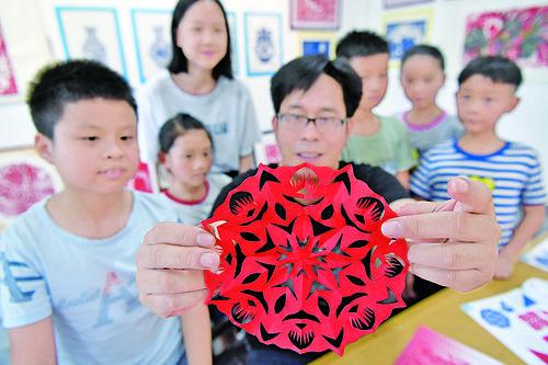 ▲7月3日,在江西省新干縣非物質(zhì)文化遺產(chǎn)傳承基地內(nèi),國(guó)家級(jí)非遺項(xiàng)目新干剪紙的傳承人彭許平在向孩子們展示剪好的窗花。 暑期來(lái)臨,為了豐富孩子們的假期生活,該基地開設(shè)國(guó)家級(jí)非遺項(xiàng)目新干剪紙暑期培訓(xùn)班,通過傳承人手把手的指導(dǎo)和傳授,讓孩子們近距離感受非遺之美。