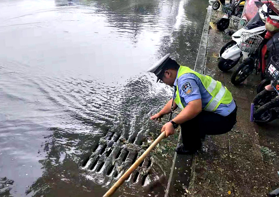 當日16時左右,市區下起了短暫的暴雨,造成鳳凰路街道積水嚴重。為保障路面交通不受影響,一中隊朝陽崗民警投入到清理下水道雜物的戰斗中。民警用手和木棍不斷清理下水道口的雜物,讓水流加快,使路面積水快速退去。經過半個小時的努力,確保了道路暢通。