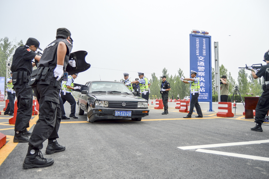 “配合檢查!否則將采取強制措施!一次警告,二次警告,三次警告。”面對情緒激動的駕駛員,民警發出3次警告后,立刻對其采取了強制措施。這是當天上午,在萬榮交警大隊皇甫執法站緝查布控系統應用提升戰法現場觀摩會上發生的一幕。當天,參訓人員來到萬榮縣,實地觀摩了萬榮交警大隊皇甫執法站緝查布控演練。