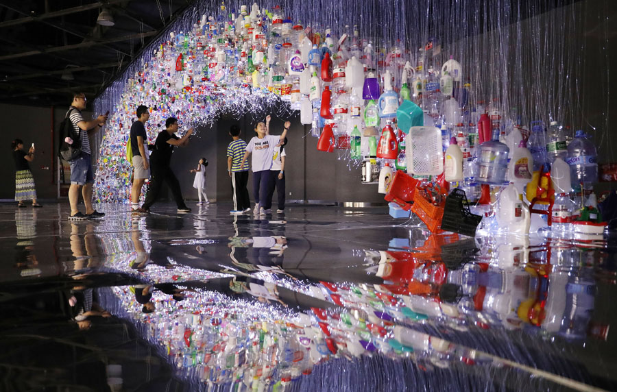 7月14日,觀眾在參觀由回收塑料制品組成的裝置藝術(shù)作品“巨環(huán)”。
