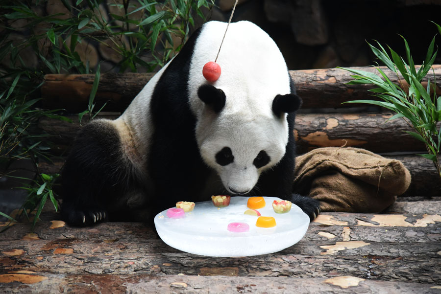 7月15日,濟南野生動物世界的大熊貓“二喜”在享用園區(qū)工作人員為它準備的包裹著冰塊的水果。