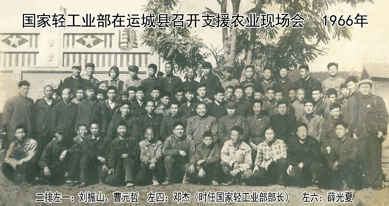 照片墻上有一張照片,1966年國家輕工業部在運城縣召開支援農業現場會。這張平淡無奇的黑白照片,卻記載了一個運城工業發展史上的里程碑事件——運城歷史上首次國家級現場會。時任國家輕工業部部長鄧杰出席會議,并與運城工交建系統的同志們合影留念。拍攝地位于安邑水泵廠——當年機械工業界赫赫有名的代表性企業。