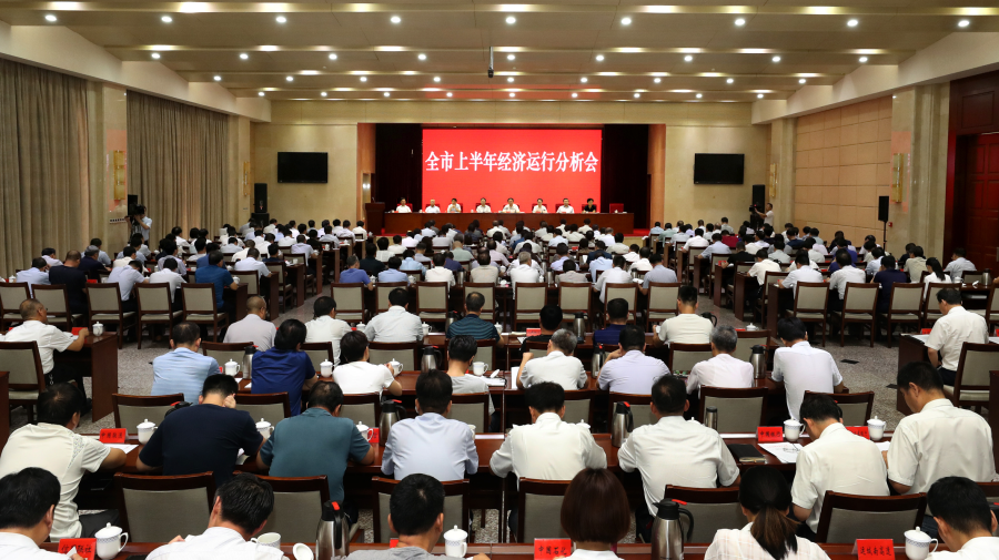 市委副書記、市長朱鵬通報上半年經濟運行情況,安排部署下半年經濟工作。市委副書記儲祥好主持會議。張潤喜、鞠振、陳杰、李濃、喬登州等市四大班子領導出席。