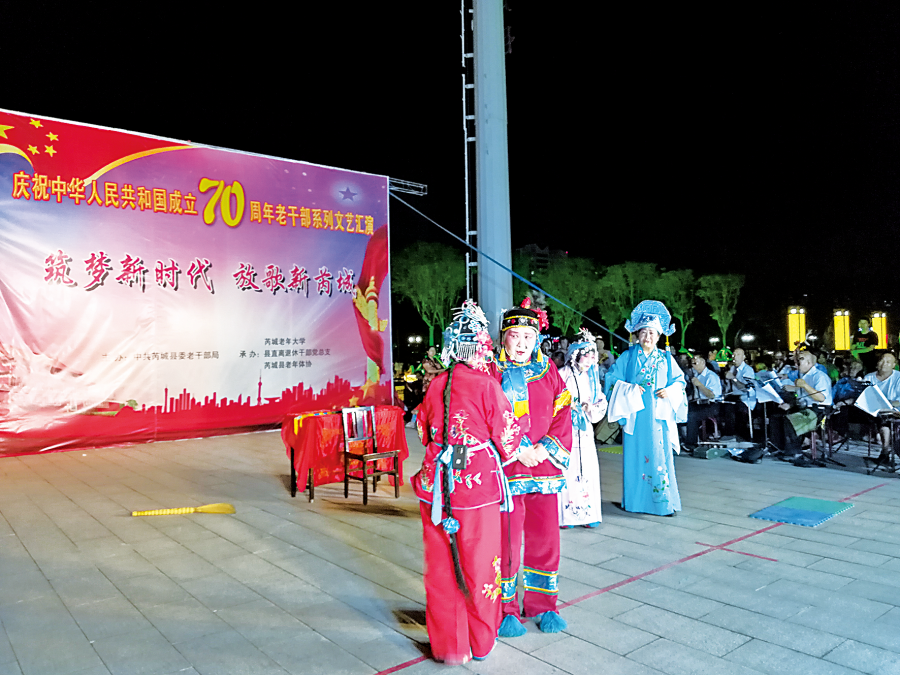 ▲近日,芮城縣老年大學戲劇班在城隍廟廣場舉辦戲劇專場演出。