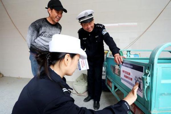 ▲10月11日,鹽湖交警大隊民警為電動三輪車貼上寫有“暢行平安路 幸福奔小康”交通安全標語的即時貼。