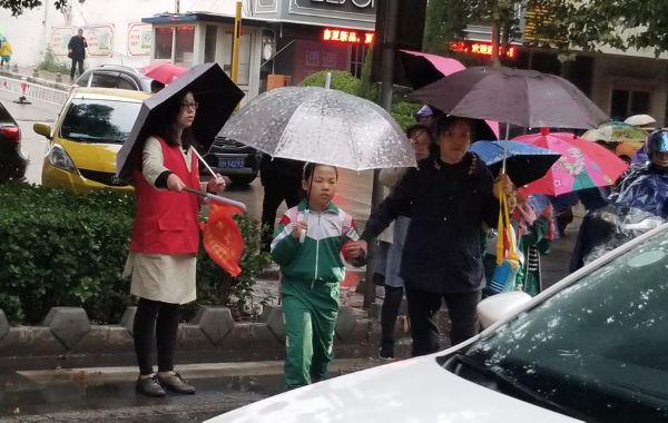 ▲志愿者冒雨在人民路小學門口配合交警疏導交通 范楚喬 攝
