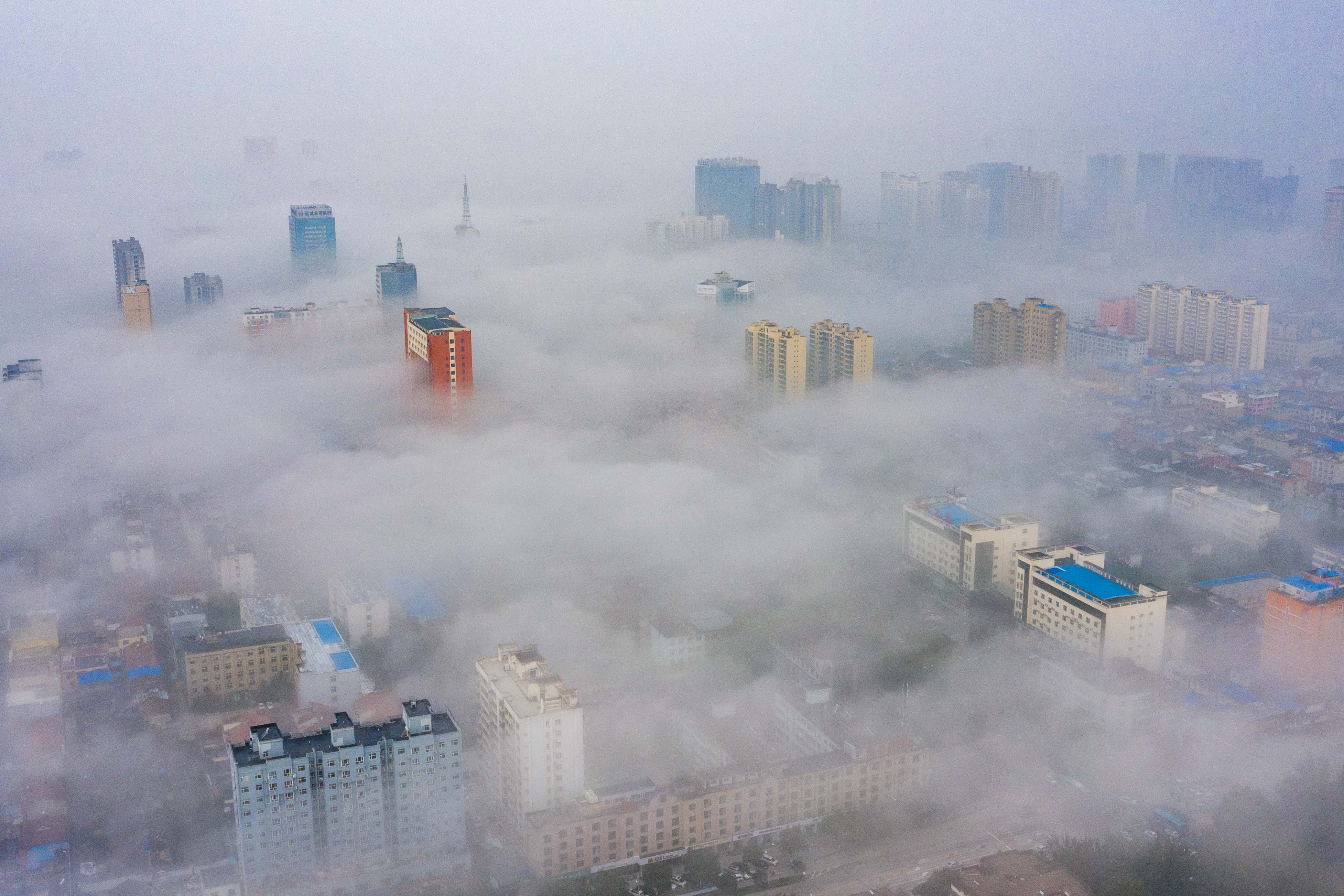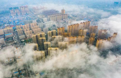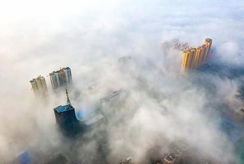 10月17日,一場(chǎng)秋雨過(guò)后,運(yùn)城市區(qū)上空出現(xiàn)平流霧景觀。晨光中,整個(gè)城市在平流霧的映襯下猶如“天空之城”。 ( 記者 薛俊 特約攝影 尚建周