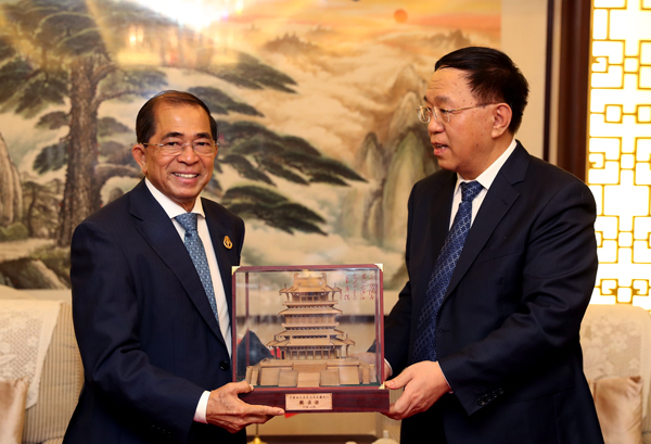 向柬埔寨商務部國務秘書桑斯雷洛(SAN SEREIRATH)贈送鸛雀樓模型紀念品 記者 雷哲俠 攝