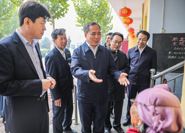 王成在鹽湖區雷家坡村日間照料中心和老人們交談。金玉敏 攝