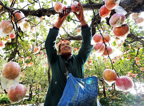 ▲10月25日,垣曲縣華峰鄉溝堎村村民在果園里摘蘋果。 特約攝影 魯國林