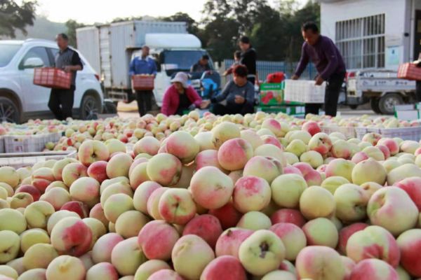 10月27日,鹽湖區上郭鄉郭家岔村民在挑選鮮桃裝箱銷往外地。