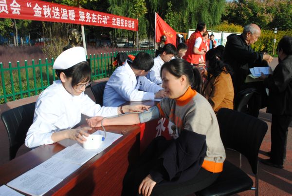 ▲10月29日,永濟市人民醫院的醫護人員給該市杏北、杏南社區的居民義診。