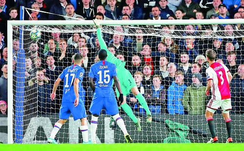 ?11月5日,切爾西隊(duì)守門員凱帕(右二)在比賽中打入烏龍球。 當(dāng)日,在2019~2020賽季歐洲足球冠軍聯(lián)賽H組比賽中,英超切爾西隊(duì)主場(chǎng)以4比4戰(zhàn)平荷甲阿賈克斯隊(duì)。 新華社發(fā)