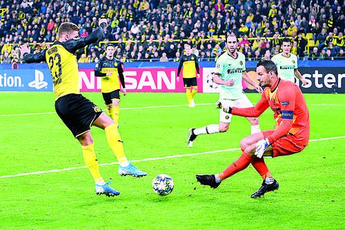 ?11月5日,多特蒙德隊球員索爾根·阿扎爾(左一)在比賽中射門。 當日,在2019~2020賽季歐冠聯賽小組賽F組比賽中,德甲多特蒙德隊主場以3比2戰勝意甲國際米蘭隊。 新華社發