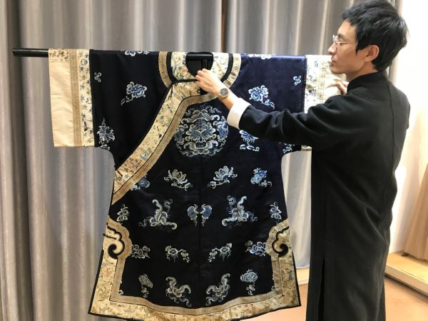 2018年1月,楊杰得知國外有件“清代石青地三藍繡女袍褂”正在拍賣,他立即托朋友打探,最終輾轉從一名亞裔英國人手中購得繡衣?!皬呐南聛淼娇爝f至我手中,整整等了1個月,看到衣服的那一刻,我非常激動,只想跟繡衣說‘你回家了’”。