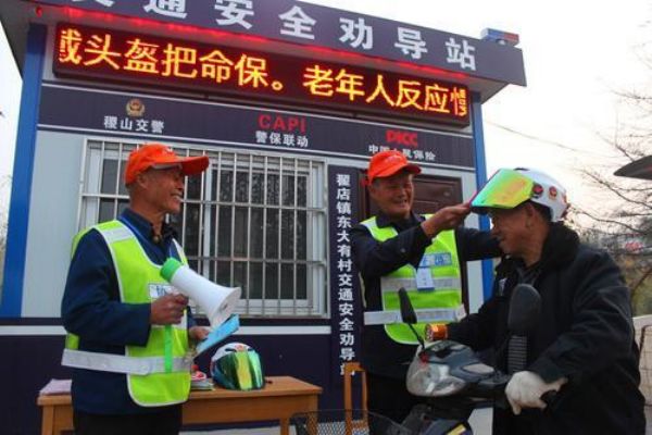 ▲11月8日,農村交通安全勸導員在稷山縣翟店鎮東大有村為一名騎摩托車的村民戴上共享頭盔。