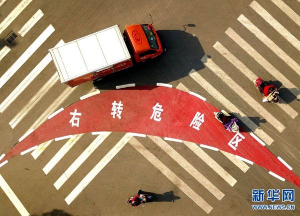 大型客、貨運車輛右轉彎時,因為駕駛員的視野盲區很大,以及車輛本身存在“內輪差”,所以容易引發交通事故。近日,洛陽市交警部門出了妙招,在路口噴涂出模擬大型車輛轉彎時因“內輪差”產生的右轉危險區。右轉危險區由兩條虛線組成,虛線圍成的狹長區域內被涂上了醒目的紅色油漆,提醒行人、非機動車注意避讓,遠離危險。 (新華社11.13)