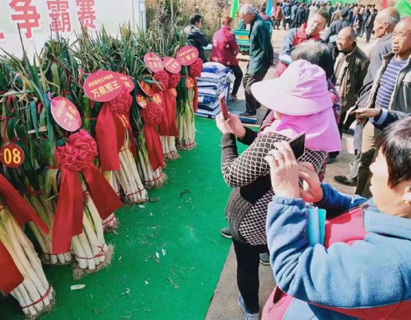 ▲在戴上紅花的獲獎(jiǎng)大蔥前,人們競相拍照發(fā)朋友圈。 王斌 攝