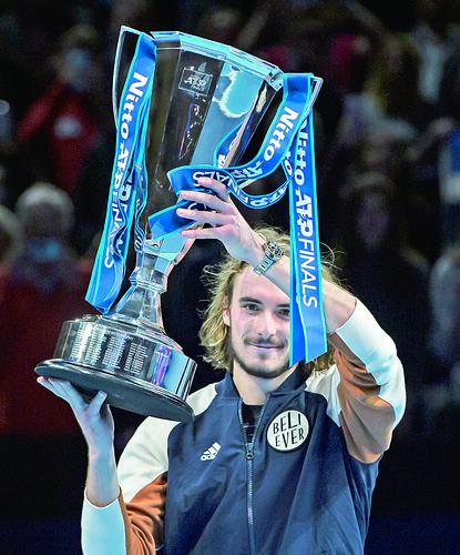 ▲11月17日,西西帕斯高舉冠軍獎杯。 當日,在2019ATP世界巡回賽年終總決賽單打決賽中,希臘選手西西帕斯以2比1戰勝奧地利選手蒂姆,奪得冠軍。 新華社記者 韓巖 攝