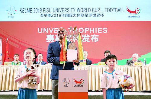 ▲11月21日,阿根廷隊足壇名宿貝隆(前中)在發布會上展示獎杯。 當日,2019年國際大體聯足球世界杯賽前新聞發布會在晉江舉行。 新華社發