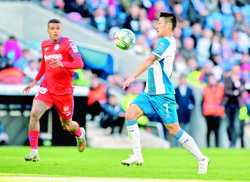 ?11月24日,西班牙人隊球員武磊(右)在比賽中控球。 當(dāng)日,在2019-2020賽季西班牙足球甲級聯(lián)賽第14輪比賽中,武磊斬獲本賽季西甲首球,幫助西班牙人隊主場以1比1戰(zhàn)平赫塔菲隊。新華社/美聯(lián)