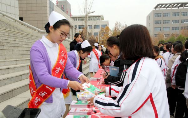 11月26日,市第二醫院護士為學生發放艾滋病防治宣傳冊。 陳婷 攝