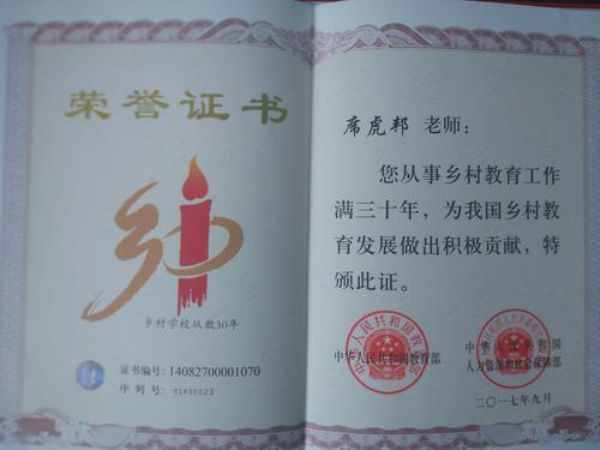 2017年9月,席虎榜從事鄉村教育事業滿30年,受到中華人民共和國教育部和人力資源社會保障部的獎勵。