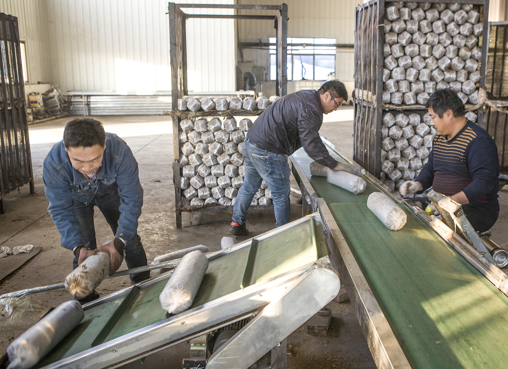 12月3日,在萬榮縣薛里村三青年集資興建的山西天地祥芮農業科技有限公司,員工們在香菇菌棒生產線緊張工作。 為了實現香菇產業的提檔升級,萬榮縣政府扶持該公司投資500萬元,引進一條最先進的大型食用菌制棒生產線和配套設施。公司年生產的200多萬個菌棒供應合作社60多戶農民和6個鄉鎮的食用菌基地,既可使公司每年純收入達100萬元,又能扶持周邊60多個菇農每戶年增收十多萬元。 特約攝影 李克榮