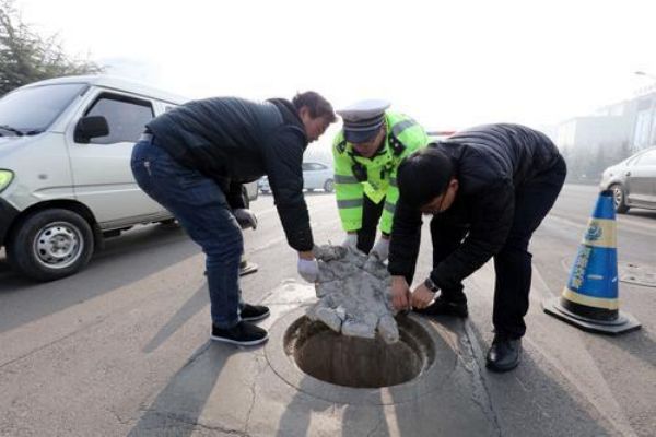 12月9日,民警和過往市民合力將破損的井蓋移除,并擺放警示標志。特約攝影 李泓曉