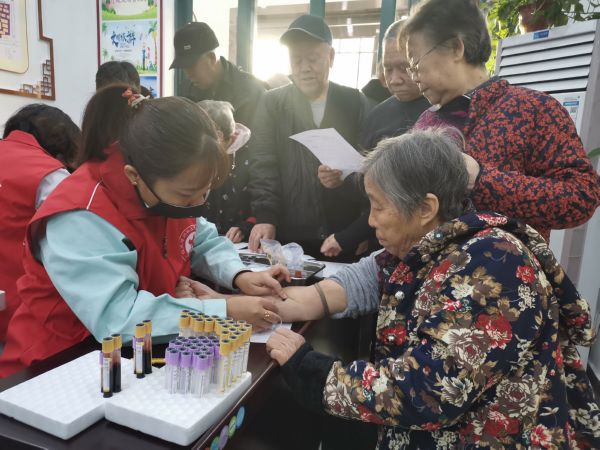 活動現場,社區工作人員組織老人們有序進行血壓、血糖、彩超、心電圖等檢查,并將老人們的血液樣本、尿液樣本送往醫院做進一步的檢查。