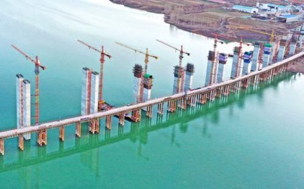 ▲12月11日,在連接晉豫兩省的垣澠高速公路垣曲亳清河大橋建設工地,一座座堅實的橋墩在小浪底水庫出水而立,施工人員冒著嚴寒在實施高空作業。特約攝影 魯國林
