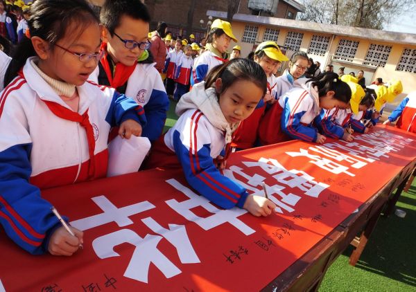 ▲12月11日,在新絳縣西街實(shí)驗(yàn)小學(xué)北校“銘記歷史砥礪前行”升國旗儀式上,師生在進(jìn)行立志簽名。特約攝影 高新生
