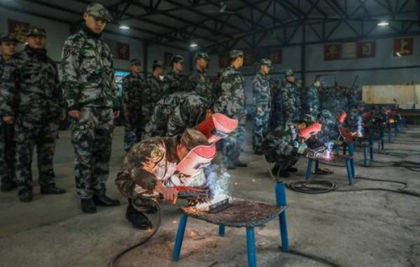 12月11日,退役軍人在山西省退役軍人運城培訓基地參加焊工培訓。