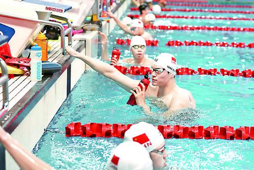 ?12月16日,國家游泳隊隊員孫楊(右一)在訓(xùn)練間隙補(bǔ)充水分。 近期,中國國家游泳隊隊員在北京國家體育總局游泳館進(jìn)行訓(xùn)練,備戰(zhàn)東京奧運會。