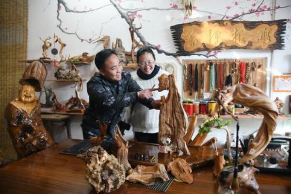 圖為王萬博與妻子一起探討根雕藝術。 特約攝影 溫徐旺 攝