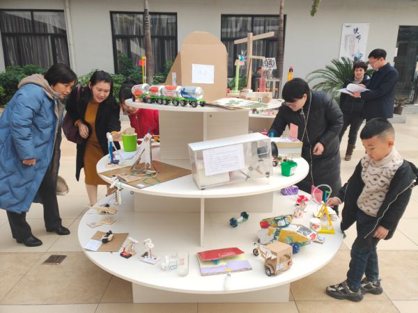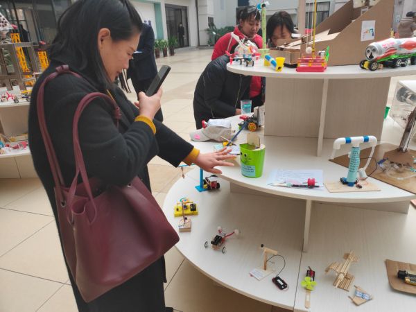 現場展品不僅綠色環保,而且科技感十足,易拉罐、礦泉水瓶、一次性紙杯,廢紙盒、雪糕棍……甚至廢棄的自行車、垃圾桶,都被利用了起來,“固液分離垃圾桶”“升降電梯”“3D打印花瓶”“手搖升旗臺”“風力摩天輪”“多功能水杯”等發明創造讓人目不暇接。繪畫作品類更是令人腦洞大開,《未來科技之城》《森林再植技》《太空城市》《自動撥瓜子器》《會飛的公交車》……300余幅科幻繪畫作品充滿童趣。