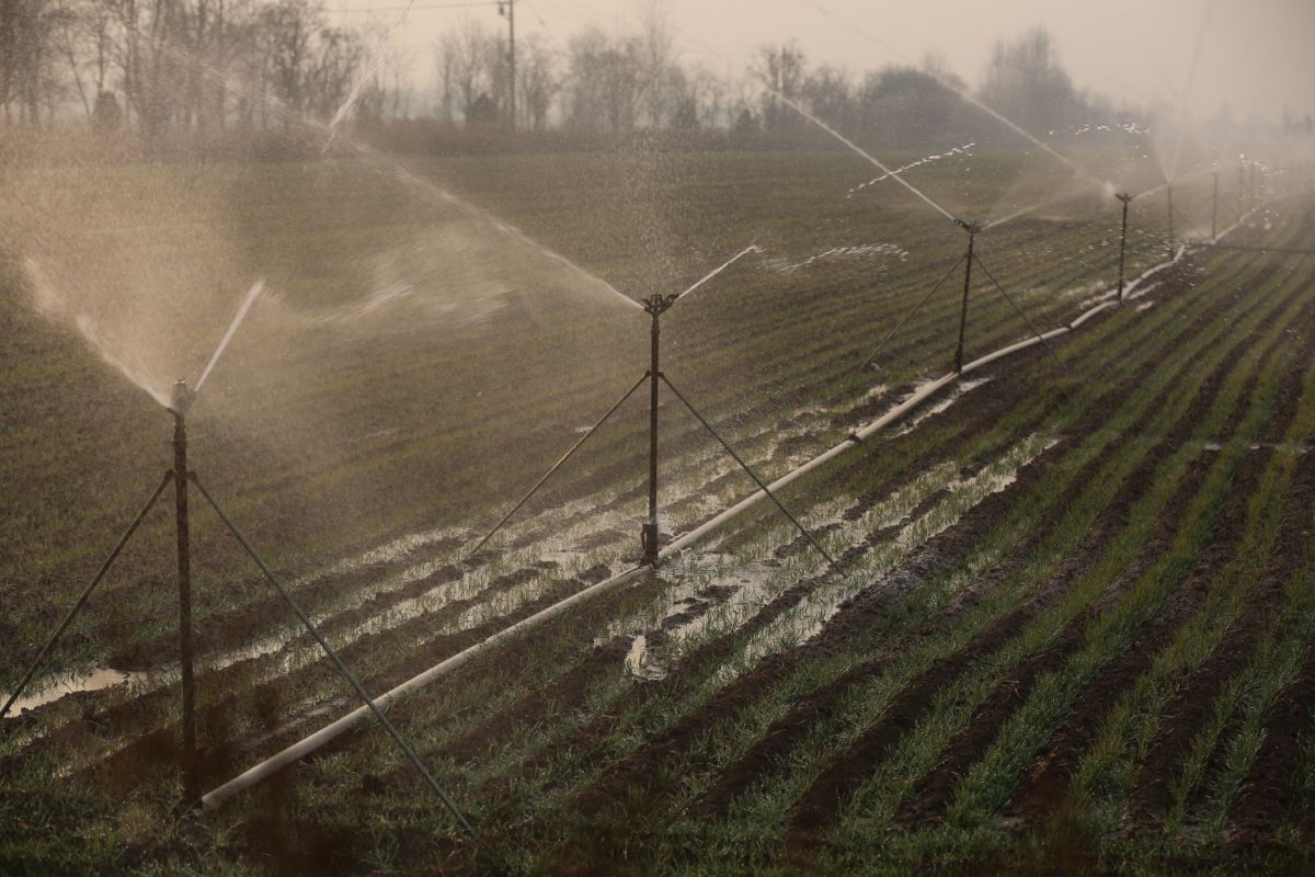 ▲12月20日下午,永濟(jì)市伍姓湖農(nóng)場(chǎng)東邊的50萬畝麥田里,農(nóng)民在利用機(jī)械噴灌系統(tǒng)為麥田普澆越冬水。