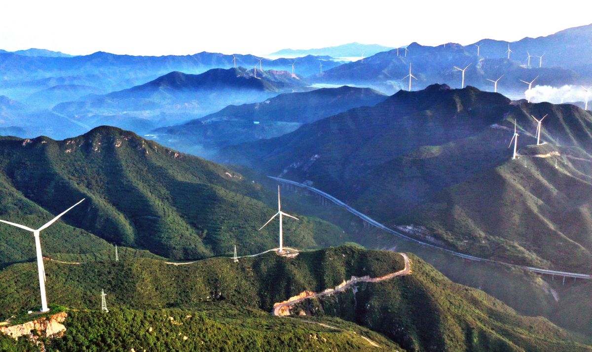 ▲12月20日,垣曲縣鐵谷山上,一個個風電機組在勁風吹動下徐徐轉動,好像群山展翅一般。