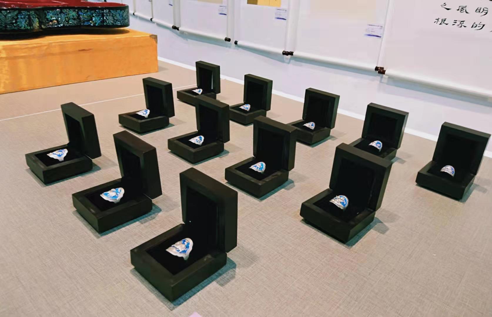 ▲任新建的十二生肖銀琺瑯戒指 王斌 攝