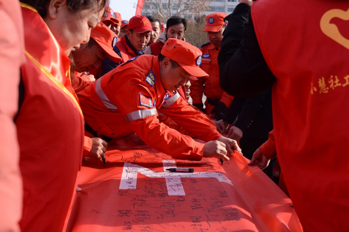 圖為運城市青年志愿者救援隊隊員在百米橫幅標語上簽名。 記者 張君蓉 攝