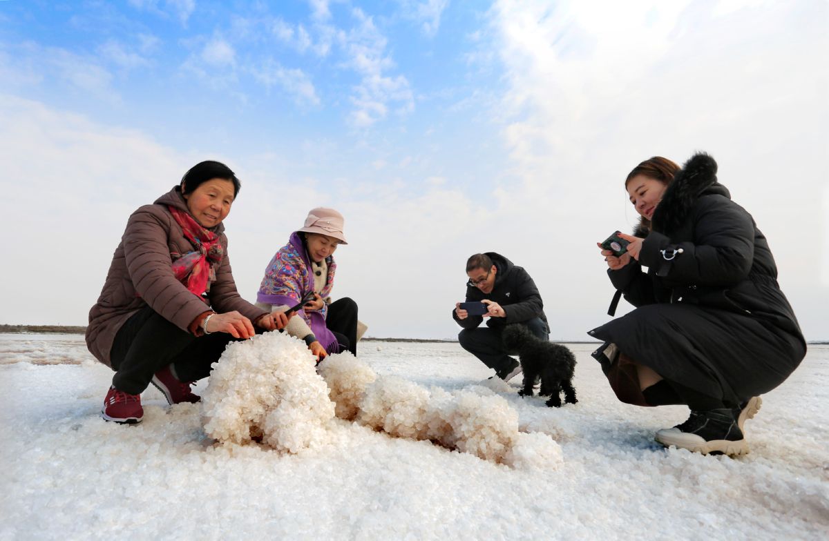 1月1日,市民在欣賞鹽湖奇觀“硝花”。