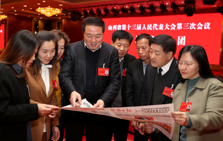運城新聞網訊 1月15日,參加省十三屆人大三次會議的運城代表團代表,利用會議間隙,認真學習《山西日報》有關政府工作報告摘要。 記者 雷哲俠 攝
