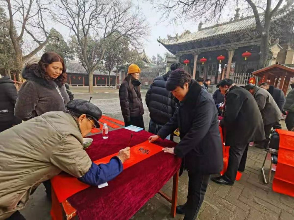 當天,解州關帝廟文管所特別邀請了張永貴、馬忠民、焦起躍三位書法家,在午門前舉行“憑門票免費獲贈春聯”活動,同時還舉行了“請門神,送平安”、祈福燈等一系列活動。在活動現場,三位書法家揮毫潑墨,忙得不亦樂乎。一幅幅墨香四溢的春聯讓在場游客贊不絕口。據統計,關帝祖廟當天共計向游客贈送春聯600余幅,祈福燈、門神共計100余個。