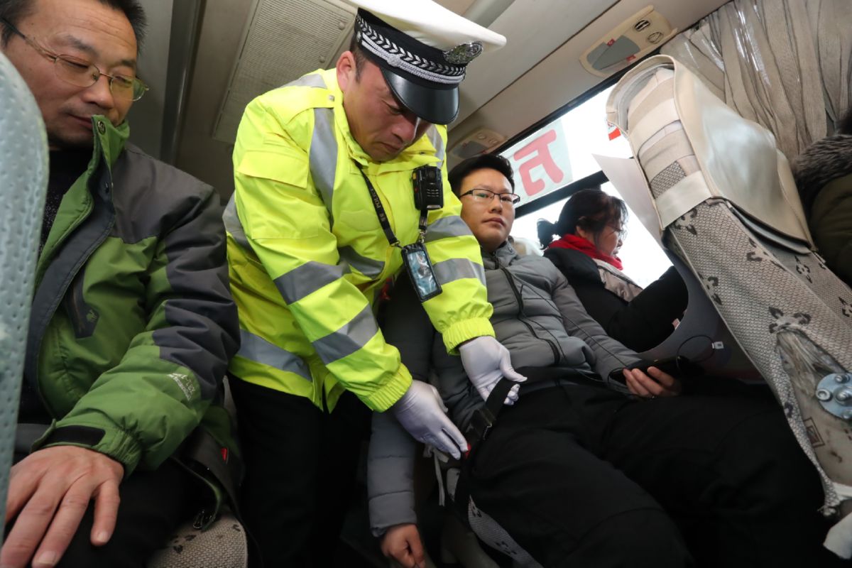 ▲民警檢查乘客系安全帶情況 李政奇 攝