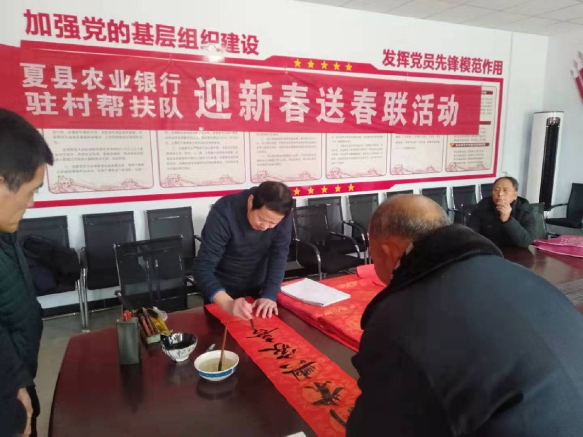 ▲春節前,夏縣農業銀行駐村幫扶工作隊在該縣西趙村開展“迎新春送春聯”活動,為村民免費書寫發放春聯。駐西趙村第一書記張明山發揮自身書法特長,共書寫春聯360余副。 張洋 攝